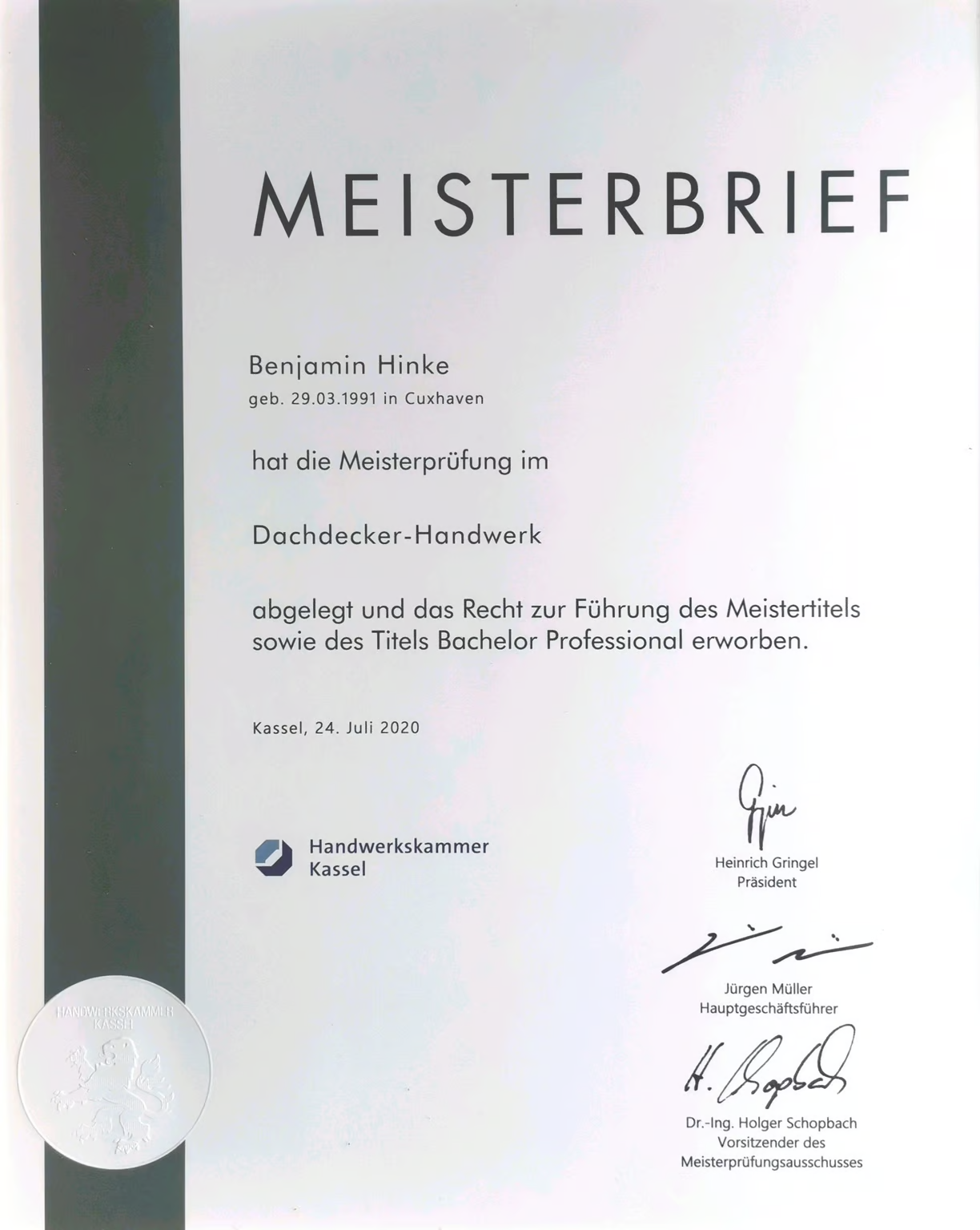 Das Team Ein einzelner Zweig bricht, aber das Bündel von Zweigen ist stark! Benjamin Hinke - Geschäftsführer- Dachdeckermeister- Zimmerermeister Antonia Theresa Marquardt - stellvertretende Geschäftsführung- Betriebsorganisation